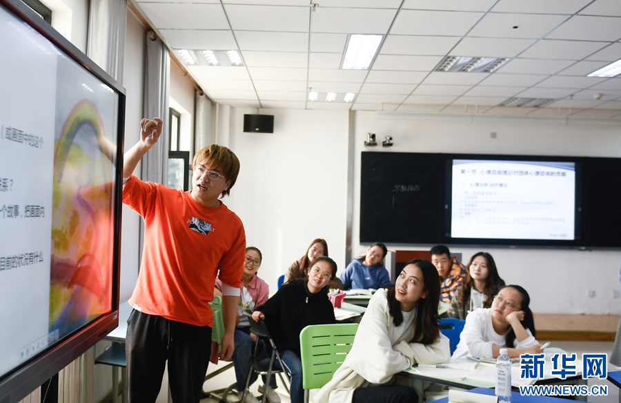 2021年4月14日,青海民族大学师范学院学生在智慧教室内使用互动屏幕进行课堂交流。新华社记者 张龙摄