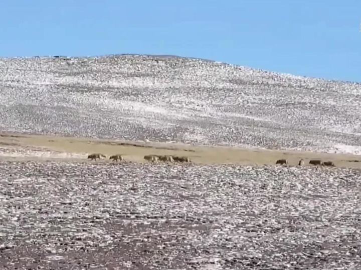 近日,在三江源国家公园长江源园区,青海省玉树藏族自治州曲麻莱县麻多乡郭洋村的生态管护员在日常巡护中拍摄到狼群活动画面,画面中十余只狼时而整齐排列向前,时而嬉闹追逐。