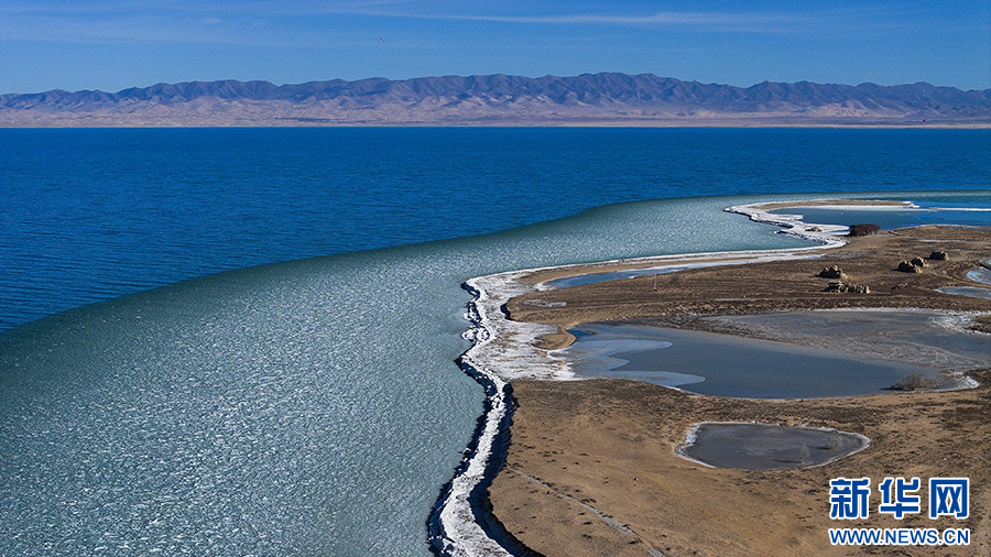 航拍青海湖半湖碎冰半湖水。新华网发(薛蒂 摄)