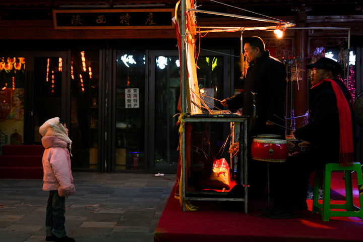 皮影戏的声响很快就吸引了不少路人。每个路过的孩子都会先好奇地跑到幕后,盯着老周手里的竹竿看看。有的小孩一边侧着头吃糖葫芦,一边盯着亮子出神,糖渣糊到脸上也顾不上擦。隔壁饭馆的大厨匆匆跑出来举着手机录像,几个年轻人凑在一起,跟着戏里的调子小声哼。寒风里,这方小小的戏台子,倒成了最热闹的地方。