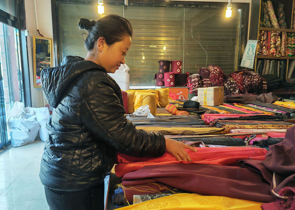 2025年11月29日,来自尼泊尔的美周在位于玉树藏族自治州的商铺销售尼泊尔布料和服饰。(柳泽兴 摄)